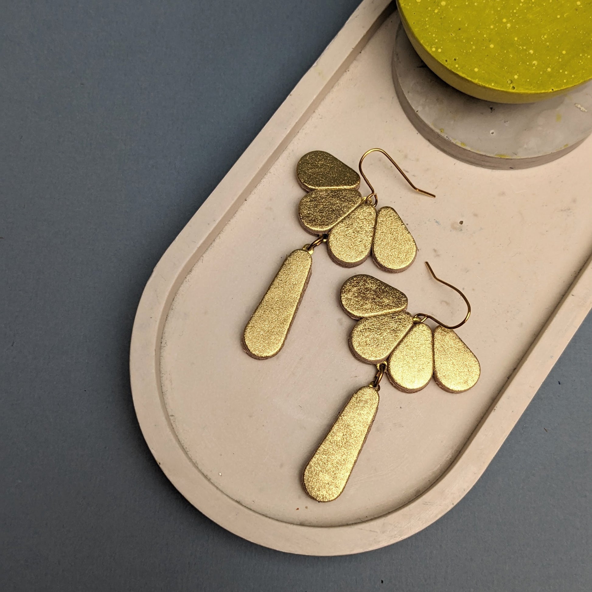 A lovely lightweight two part dropper earring, made from individual teardrops of hand cut reclaimed leather.